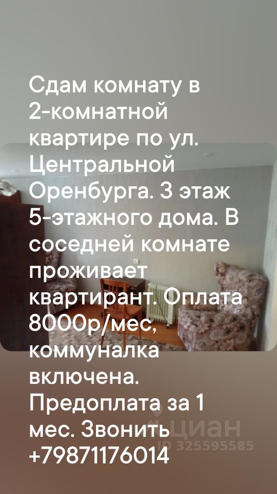 Сдам комнату в 2-комнатной квартире по ул. Центральной Оренбурга. 3 этаж 5-этажного дома. Горячая и холодная, вода. В комнате есть всё для проживания. Кухня, коридор и санузел (совмещённый). Интернет есть. В соседней комнате проживает квартирант. Оплата 8000р/мес, коммуналка включена. Предоплата за 1 мес.