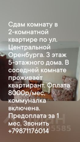 Сдам комнату в 2-комнатной квартире по ул. Центральной Оренбурга. 3 этаж 5-этажного дома. Горячая и холодная, вода. В комнате есть всё для проживания. Кухня, коридор и санузел (совмещённый). Интернет есть. В соседней комнате проживает квартирант. Оплата 8000р/мес, коммуналка включена. Предоплата за 1 мес.Предоплата за 1 месяцЗалог 8 000 ₽