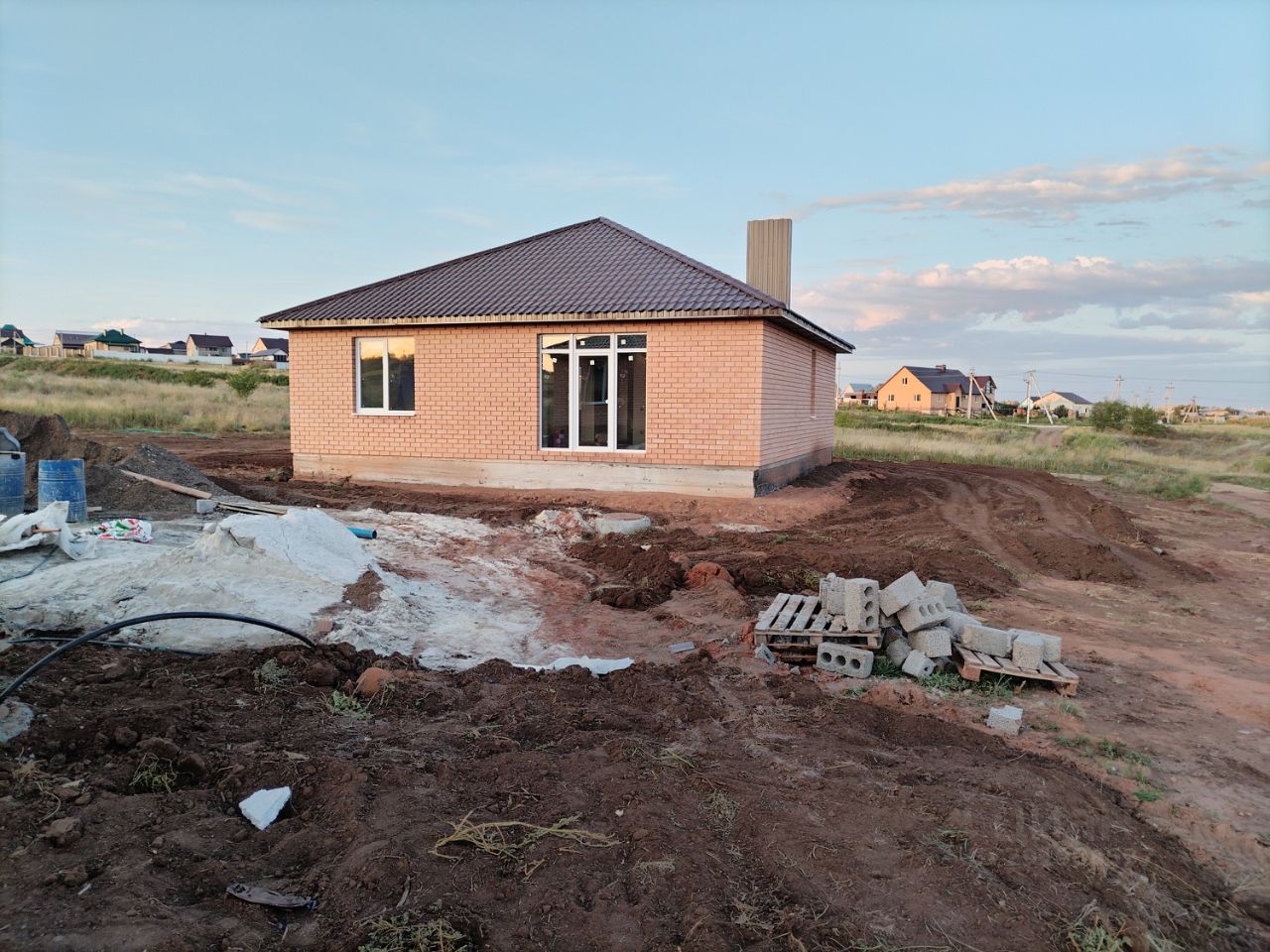 Дома построены из керамзитоблока + утеплитель+ облицовочный кирпич. Фундамент свайно-ленточный. Глубина свай 2-3 м. (в зависимости от грунта). Кровля - металлочерепица, парогидроизоляция крыши в несколько слоев, утепленный потолок толщиной 15-20 см. , утепление кровли по СНИПам, отмостка вокруг дома