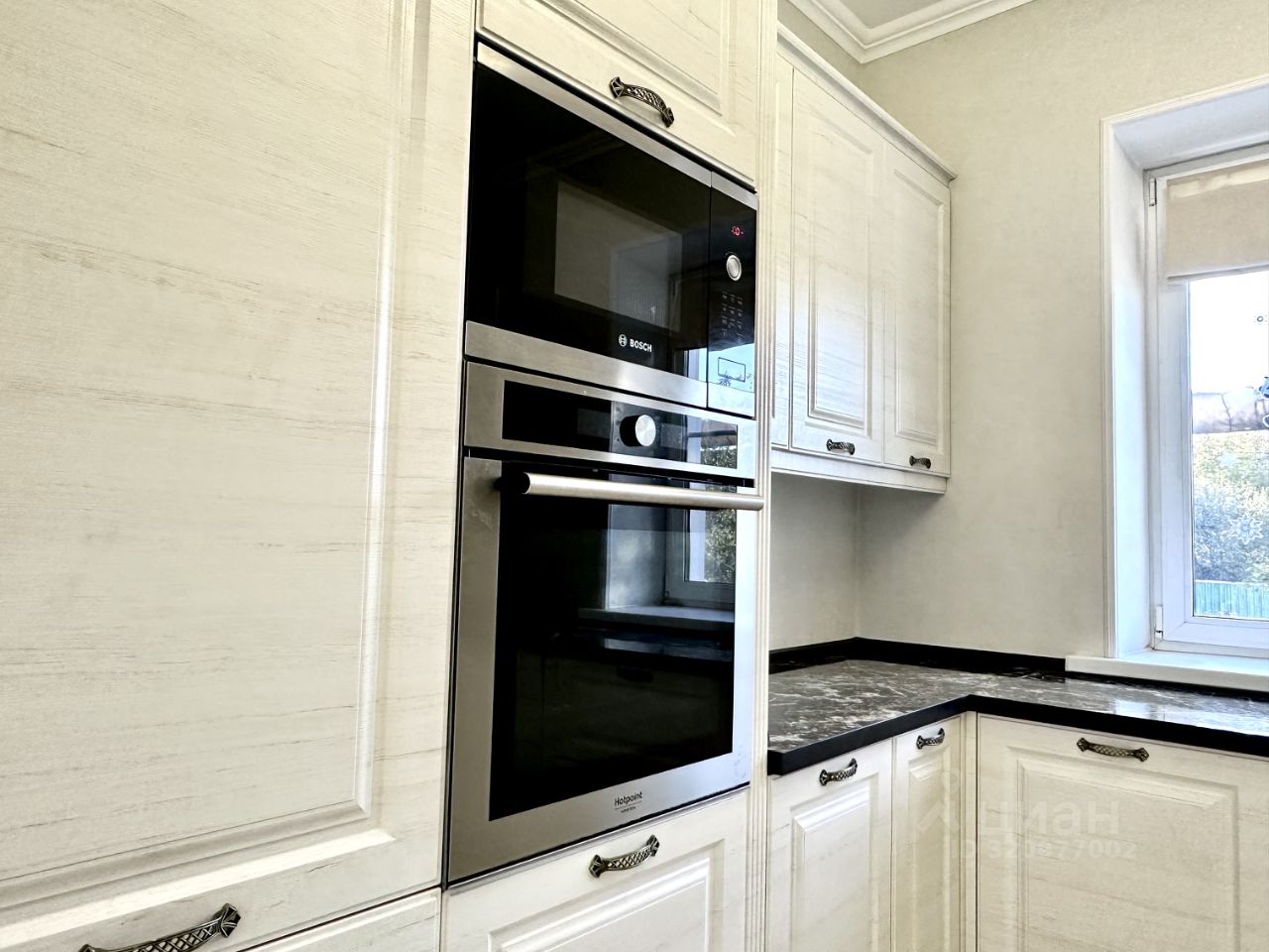 Первый этаж: Просторная кухня- гостиная 45 кв. м., в которой установлен качественный кухонный гарнитур со столешницей из камня, встроенной техникой Bosch и Ariston европейской сборки ( холодильник, духовой шкаф, микроволновая печь, посудомоечная машина, вытяжка и газовая варочная поверхность), кабинет 11 кв.м., можно использовать как комнату, Сан. Узел с душевой, выход на террасу и в гараж.