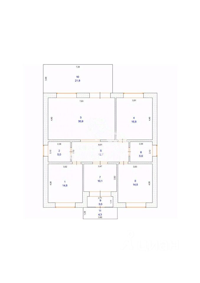 Площадь дома около 130 кв. м :( ( размер дома 11м х 12 метров), 3 спальни, кухня гостиная, сан. узла, гардеробная.