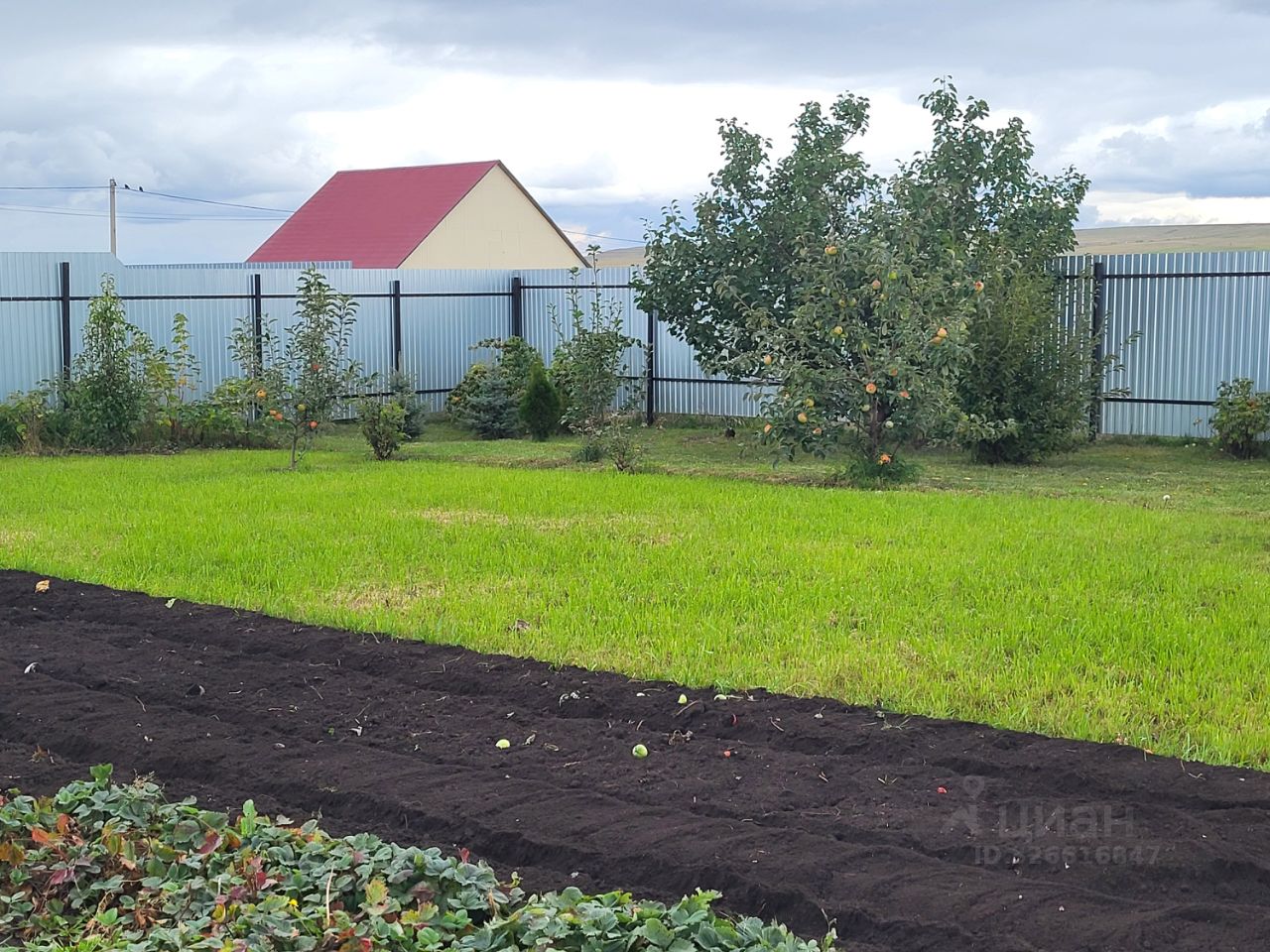 Участок частично огорожен ( 3 стороны). На территории имеется участок земли с плодово- ягодными насаждениями, а также участок удобренной земли для выращивания овощей и цветников.