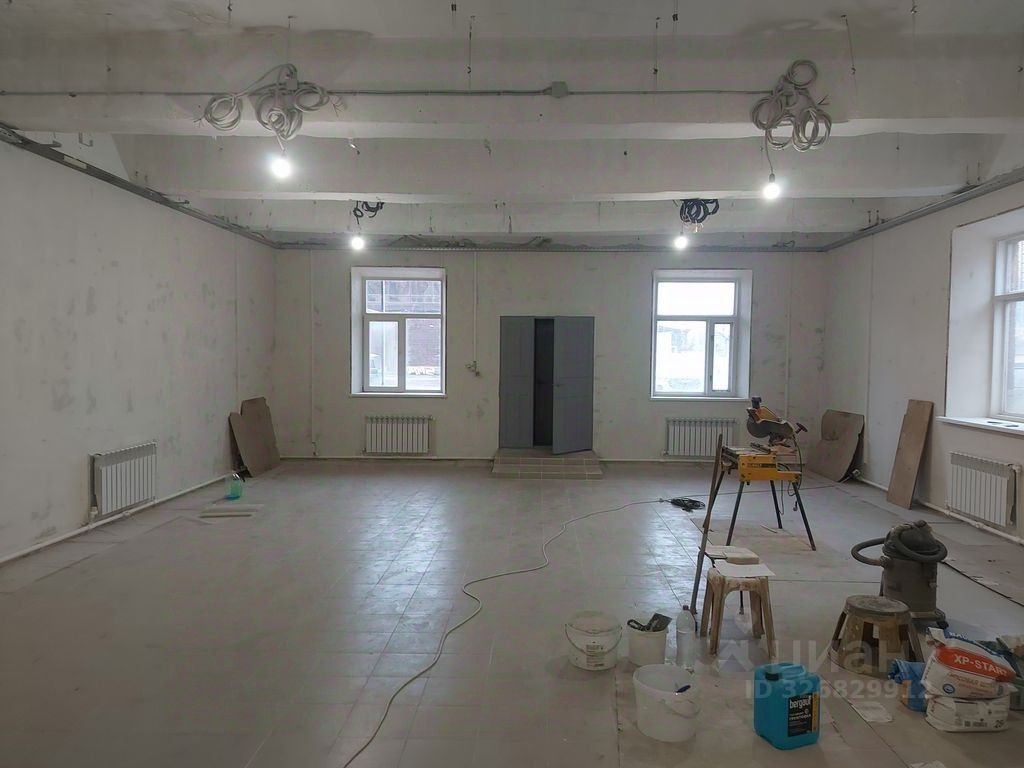 В помещении выполнен косметический ремонт: пол ровный (плитка), окна пластиковые, стены выкрашены в белый цвет. Размер помещения 12,2м х 8,2м без колонн и перегородок + отдельный санузел.